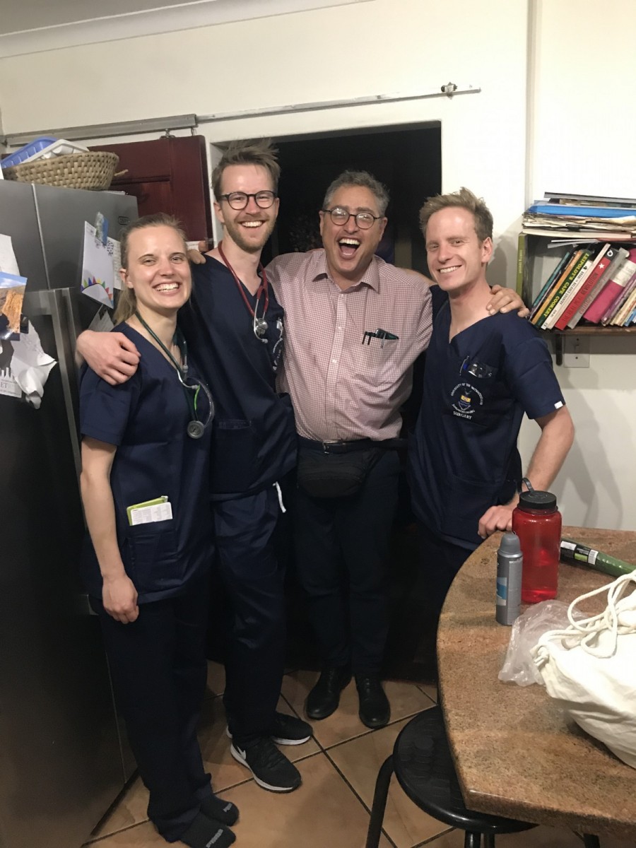 FAZIT Tag 1: 1) fast alle sind sehr nett und meist auch hilfsbereit! 2) man arbeitet recht selbstständig und hat auch eine gewisse Verantwortung, dass die Patienten auch das bekommen, was sie brauchen (z.B. Gewisse BIldgebung, Medis). 3) vieles dauert einfach sehr lange und geht manchmal über komplizierte Umwege. 4) es ist definitiv eine ganz andere Erfahrung hier zu sein und gar kein Vergleich zu Deutschland: allein am ersten Tag haben wir von Schusswunden, über Stichverletzungen bis zu unzähligen Opfern von Verkehrsunfällen schon jede Menge Deutschland-untypischer Patienten gesehen. 5) Wir waren schon ziemlich kaputt, auch wenn wir auf dem Foto recht entspannt aussehen. Vielleicht ist es die Freude darüber, unsere erste Schicht überstanden zu haben, gleich Essen zu bekommen und zeitnah schlafen zu dürfen 😀 6) es ist schon irgendwie interessant, aber auch etwas überfordernd und wir sind schon gespannt, was die nächsten Wochen noch so bringen werden.