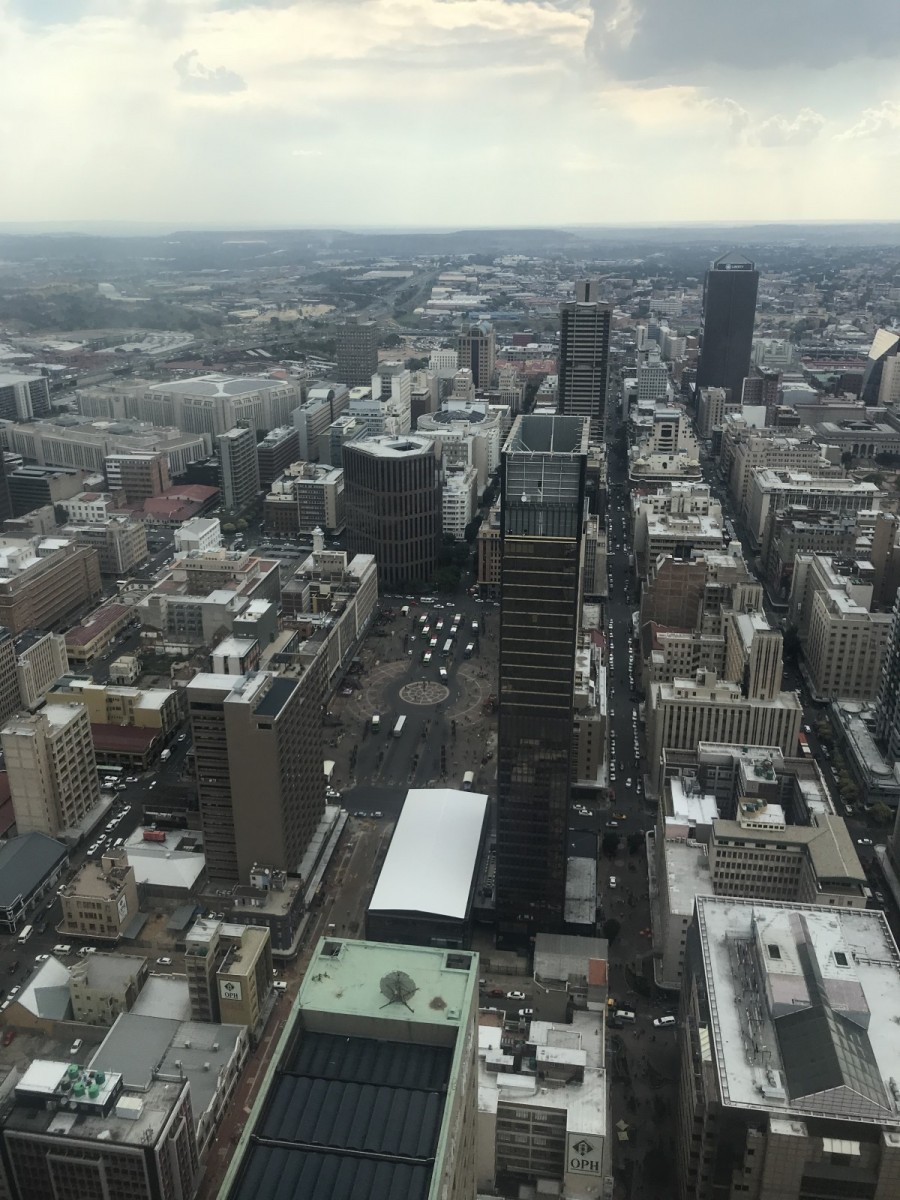 Danach sind wir dann nochmal mit dem Auto Richtung City Center gefahren. Ein Bereich der Stadt, der recht umstritten ist. An der Grenze zu Hillbrow gelegen sind die Straßen hier gesäumt von Hochhäusern und es sind viele Menschen unterwegs (so gut wie keine Weißen). In der Gegend gibt es aber auch viel Umbruch und nicht weit entfernt liegt auch das künstlerisch angehauchte Gebiet „Maboneng“. Je nachdem wen man fragt, bekommt man entweder zu hören, dass man dort am besten gar nicht hinfahren sollte (oder nur mit einem Einheimischen) oder, dass es eine sehr interessante Gegend ist und es viel zu entdecken gibt. Wir sind mit dem Auto auch direkt ins Parkhaus des Carlton Centers gefahren, das größte Gebäude der Stadt, um vom Top of Africa (der obersten Etage) einen Blick über die Stadt zu erhaschen. Das hat sich dann auch wirklich gelohnt, da man für umgerechnet 2€ weit gucken konnte.